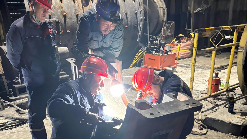 故障發(fā)生后,白玉銀興公司經(jīng)理田東清迅速抵達(dá)現(xiàn)場,根據(jù)設(shè)備故障狀況進(jìn)行現(xiàn)場研判并采取果斷措施進(jìn)行停機(jī)搶修。在搶修現(xiàn)場,黨員干部主動亮身份、扛重?fù)?dān),充分發(fā)揮先鋒模范作用,成為搶修隊伍中的“主心骨”。田東清帶領(lǐng)維修團(tuán)隊趴在設(shè)備旁仔細(xì)排查故障點,在刮瓦環(huán)節(jié)精細(xì)操刀,憑借多年豐富經(jīng)驗和專業(yè)技術(shù)儲備,勾畫出完美的弧線。為了加快搶修進(jìn)度,搶修人員放棄休息時間,輪班作戰(zhàn)、每天連續(xù)工作16小時,累了就趴在桌上短暫小憩,始終堅守在搶修一線。食堂將飯菜、飲用水送到現(xiàn)場,確保搶修人員有充沛的體力。
