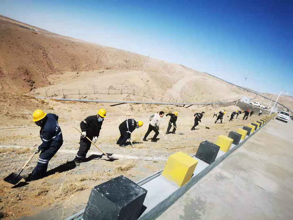 本次活動重點對基礎壩兩側(cè)坡面進行綜合治理,治理長度約1.5公里。面對坡陡、風大、黃沙亂舞的工作環(huán)境,黨員干部不懼困難、以身作則、俯沖一線,帶頭撿拾垃圾、清理尾砂、覆土灑水以及對安全警示牌進行維護保養(yǎng)。廣大職工緊跟其后,或一字排開,或矩陣展開,忙碌的身影遍布整個坡面,鏟車的轟鳴聲、鐵锨的吱吱聲與狂風的呼嘯聲琴簫合奏,在藍天、斜陽和荒山的襯托下,勾勒出一幅“聲與色”、“動與靜”相得益彰的勞動生產(chǎn)畫卷。